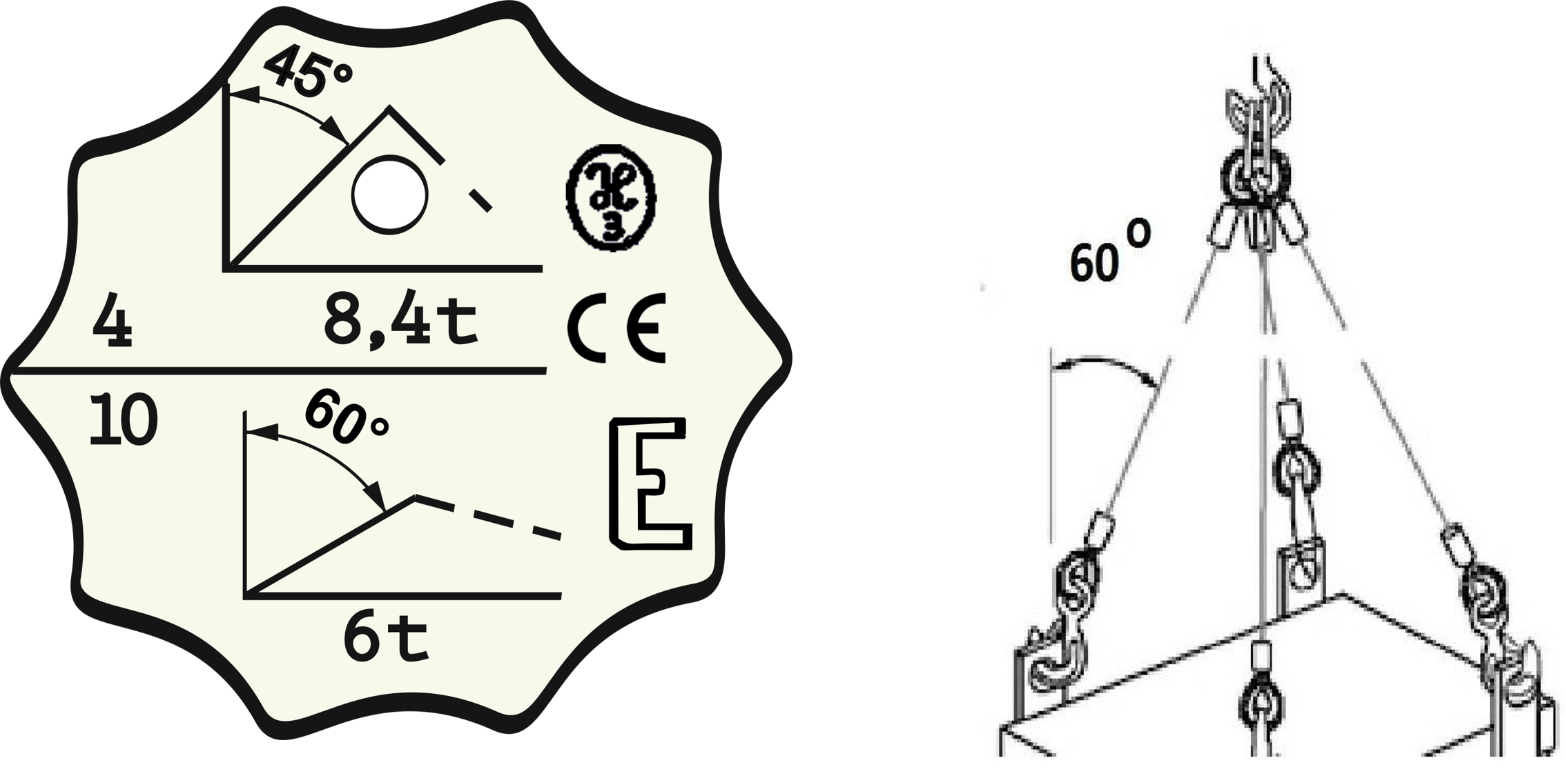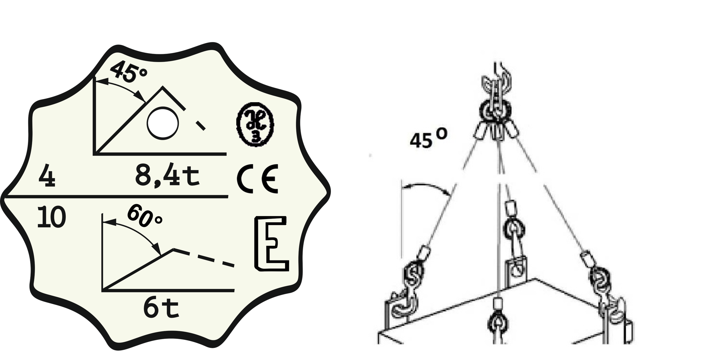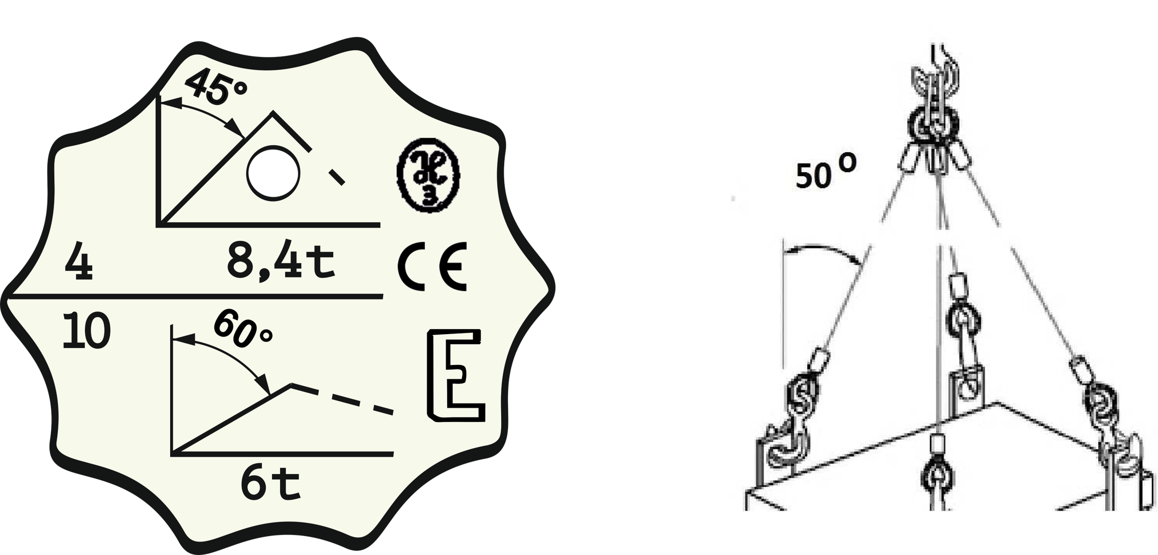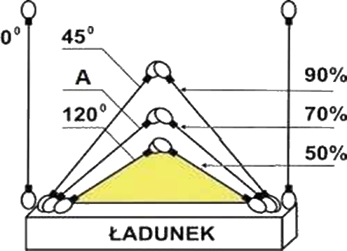 W oparciu o przedstawiony rysunek określ maksymalną masę ładunku jaką można podnieść przy pomocy zawiesia 4 cięgnowego:
